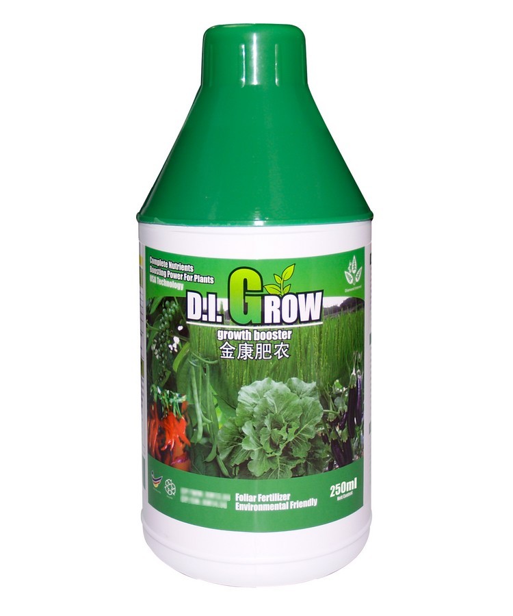 Notre engrais D.I GROW de croissance liquide organique formé avec le meilleur de la formule à base d'algues, contenant des éléments complets ioniques, les deux éléments, macro ioniques (NPK, Ca, S), les micro (Fe, Ze, Cu, Mo, Mn, B, CI). Il est mis sur pied par la firme pharmaceutique Dynapharm sur le marché des fertilisants agricoles «Di - Grow», fabriqué en Malaisie. Ce produit présenté sous deux composantes, en vert (pour la végétation et les animaux) et en rouge (pour la floraison ), est disponible en bidons de 4 litres, d'1 litre et 250ml. Les avantages du fertilisant liquide «Di - Grow» sont multiples. L'engrais est naturel, organique, non toxique et écologique. En plus, ce produit contient des essences naturelles de stimulation de croissance. Ce qui est plus important encore, c'est le fait que ce fertilisant liquide convient à toutes les cultures et même à l'élévage.