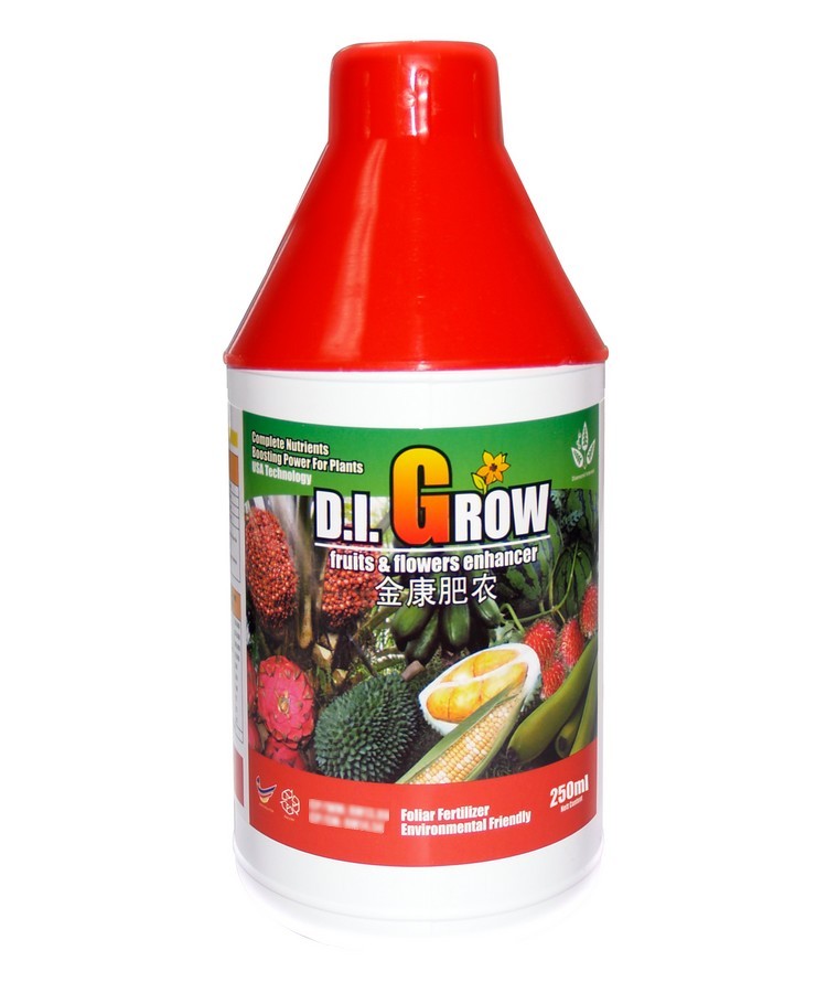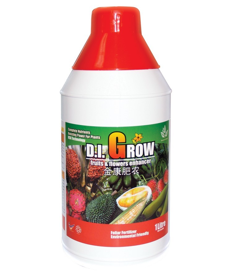 Notre engrais D.I GROW de croissance liquide organique formé avec le meilleur de la formule à base d'algues, contenant des éléments complets ioniques, les deux éléments, macro ioniques (NPK, Ca, S), les micro (Fe, Ze, Cu, Mo, Mn, B, CI). Il est mis sur pied par la firme pharmaceutique Dynapharm sur le marché des fertilisants agricoles «Di - Grow», fabriqué en Malaisie. Ce produit présenté sous deux composantes, en vert (pour la végétation et les animaux) et en rouge (pour la floraison ), est disponible en bidons de 4 litres, d'1 litre et 250ml. Les avantages du fertilisant liquide «Di - Grow» sont multiples. L'engrais est naturel, organique, non toxique et écologique. En plus, ce produit contient des essences naturelles de stimulation de croissance. Ce qui est plus important encore, c'est le fait que ce fertilisant liquide convient à toutes les cultures et même à l'élévage.