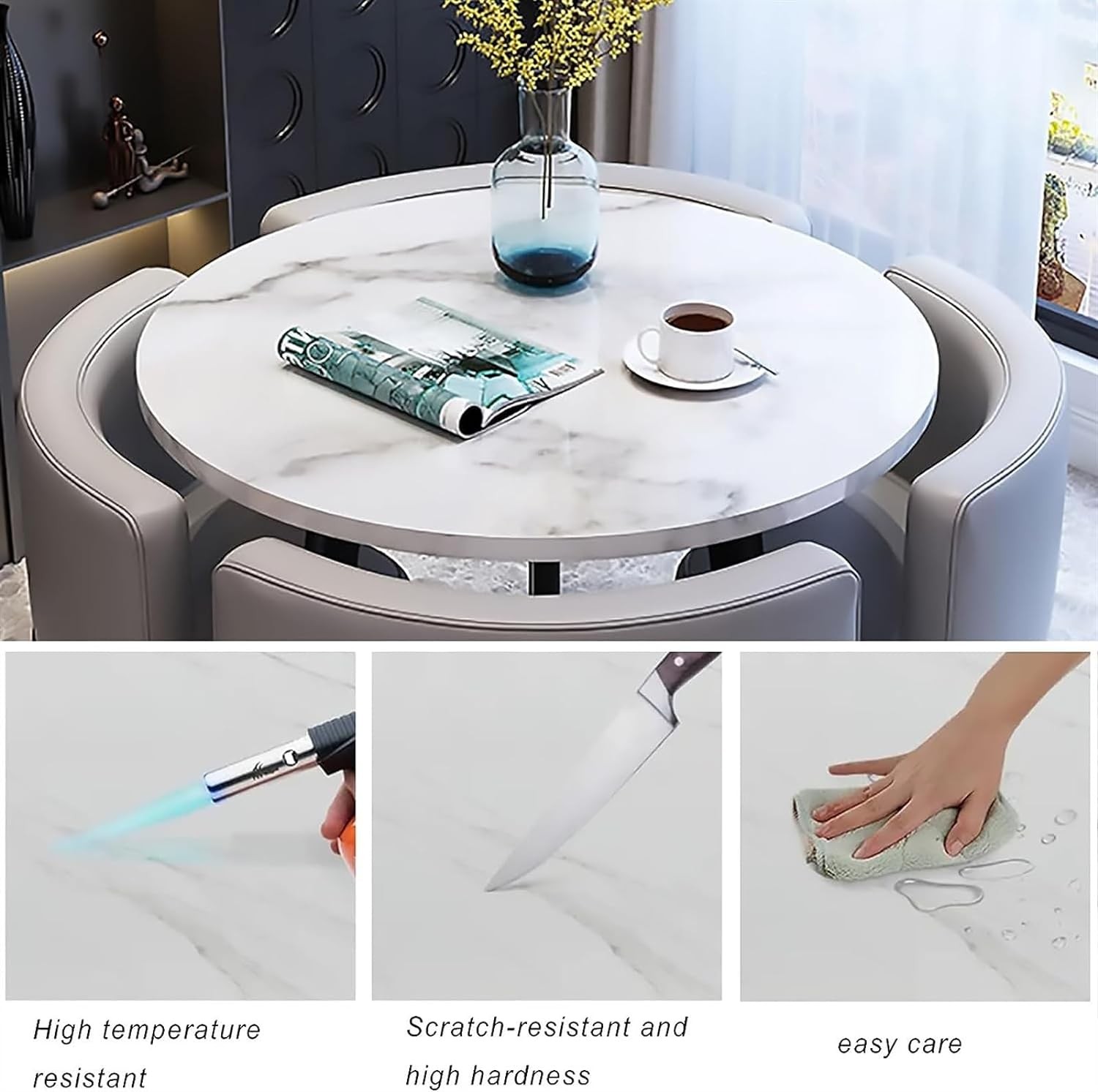• Application polyvalente : le design lisse apporte une sensation de fraîcheur à votre salle à manger. La table et les chaises de cuisine rondes peuvent non seulement être utilisées à la maison, mais aussi dans les cafés, les centres de réception, les bureaux, les halls d'hôtel, les cinémas, les bibliothèques, les bureaux de vente et d'autres endroits.