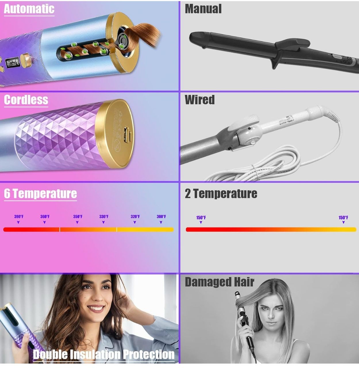 6 températures et 6 conceptions de minuteries : Afin de répondre aux besoins des différents types et styles de cheveux, notre fer à friser automatique fournit des réglages de température réglables de 300℉ à 390℉ pour s'adapter à différents types de cheveux, et la conception de la minuterie de 8 à 18 secondes peut facilement choisir entre des boucles légèrement bouclées, moyennes et serrées