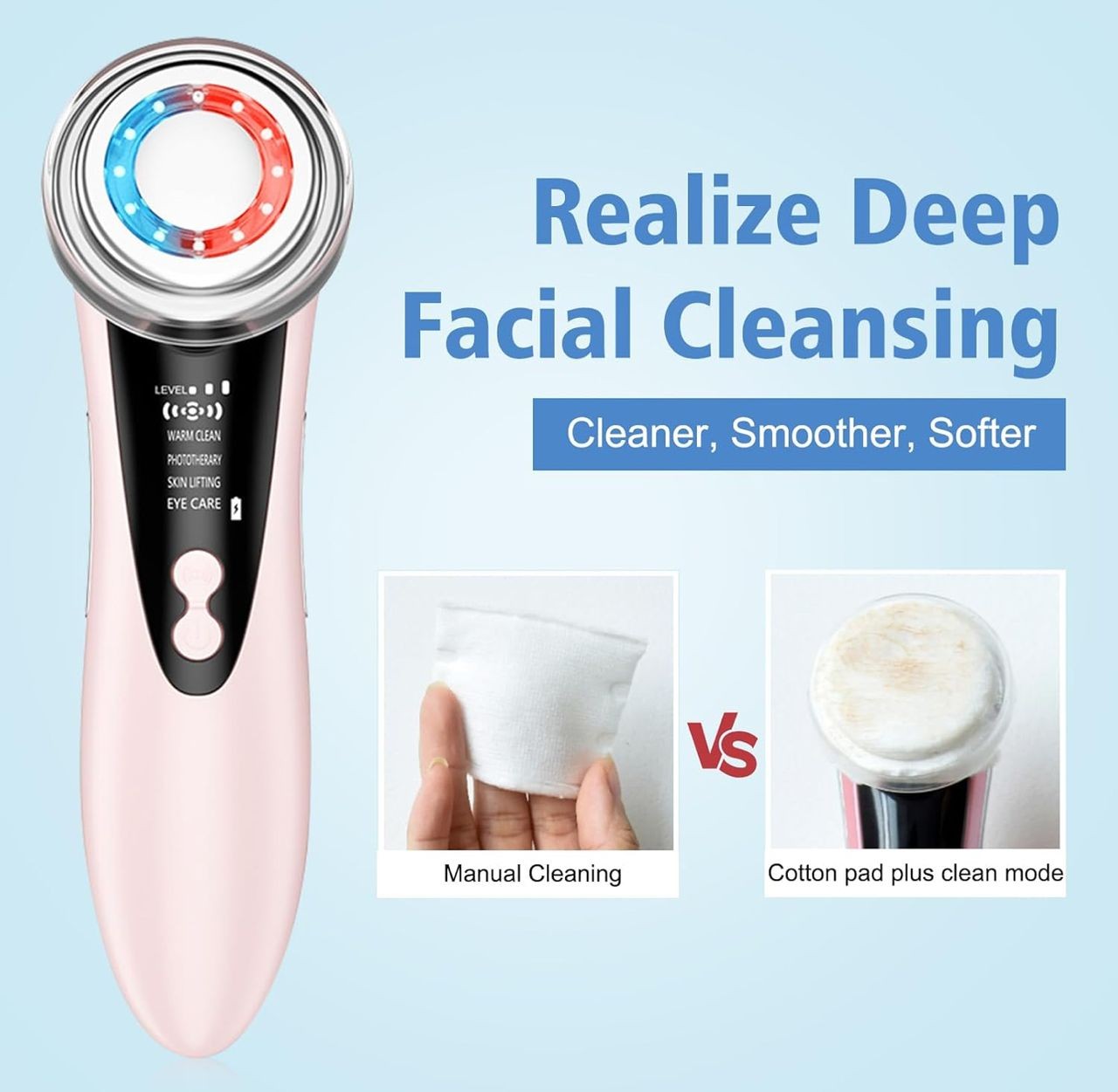 NETTOYAGE EN PROFONDEUR Le masseur facial utilise la technologie de dilatation ionique et la vibration ultrasonique à haute fréquence pour ouvrir les pores, éliminer les résidus cosmétiques, éliminer la graisse et la saleté des pores, réduire l'obsturation des pores et nettoyer la peau.