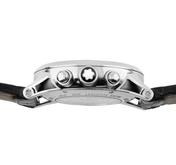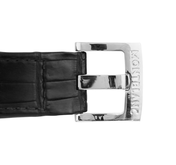 • Le boîtier de 42 mm en acier inoxydable, qui alterne finition polie et satinée, est gravé de l’emblématique Mont Blanc, d’une boussole et de deux pics à glace croisés, en référence à l’univers de l’alpinisme.