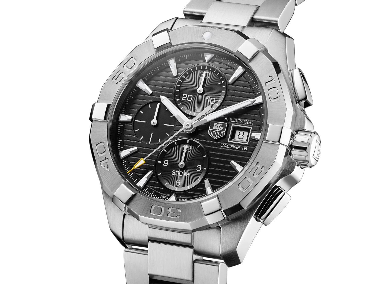 • Véritable montre de plongée grâce à sa couronne et son fond vissés, cette montre TAG Heuer Aquaracer porte également une cloche de plongée gravée sur le fond de boîte