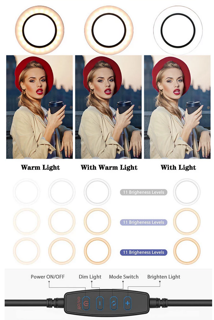 | Carcat. 2 | 3 modes d'éclairage et 11 niveaux de luminosité Anneau lumineux à DEL dimmable de 10,2 pouces avec 3 modes d'éclairage: chaud, naturel et froid, température de couleur: 2300K-6000K. Chaque mode d'éclairage a 11 luminosité réglable à choisir. Vous pouvez ajuster les modes et la luminosité pour répondre à vos besoins d'éclairage à différentes occasions. |
