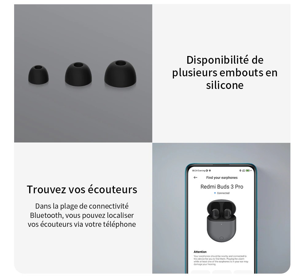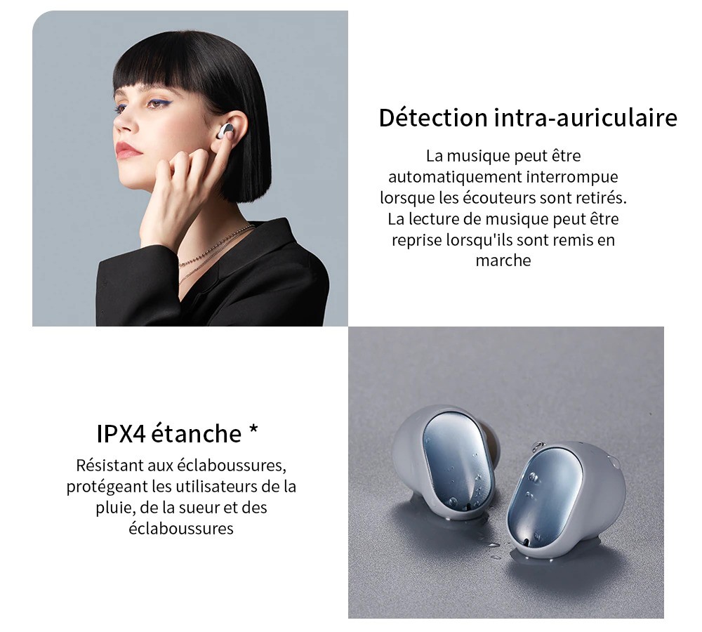 • . Même si les commandes sont réactives, il est impossible de gérer le volume ou de revenir à la piste précédente via ces commandes. Un temps d'adaptation sera nécessaire pour bien prendre en main les écouteurs, d'autant plus qu'il n'y a que très peu d'alertes sonores. Les Redmi Buds 3 Pro embarquent aussi un capteur de présence qui permet de mettre automatiquement en pause la lecture lorsqu’un des écouteurs est retiré de l’oreille, puis de la relancer quand il est remis en place.