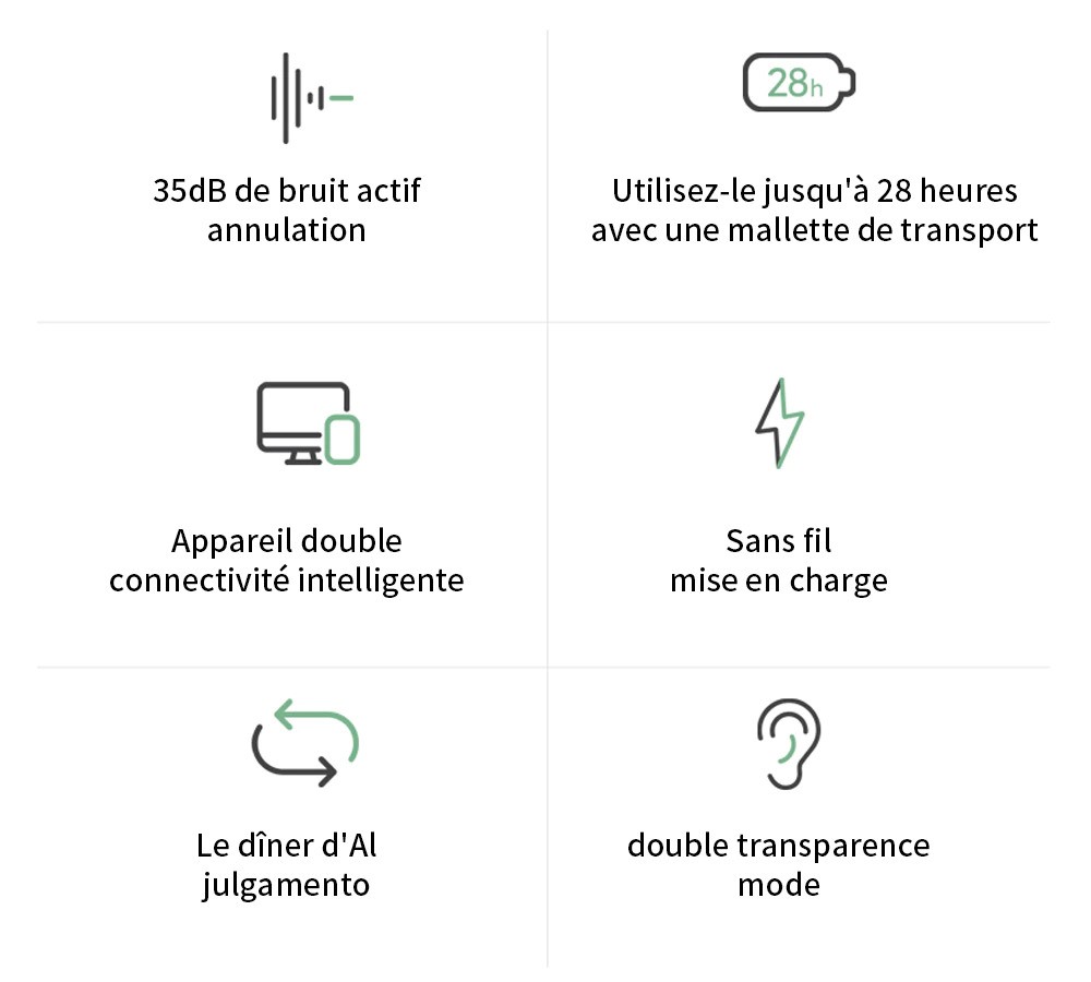 • Suppression intelligente du bruit de 35 dB - Connexion à deux appareils