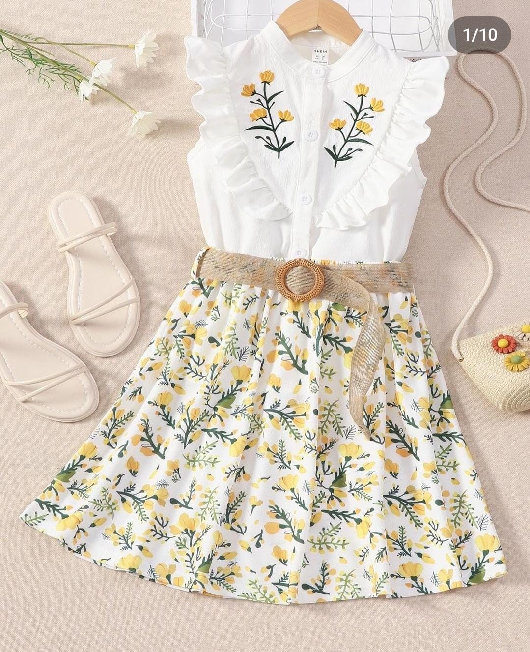 Ensemble PP Vêtements De Couture Florale Pour Les Filles Âgées De 1 À 14 Ans Jupe Courte Manches