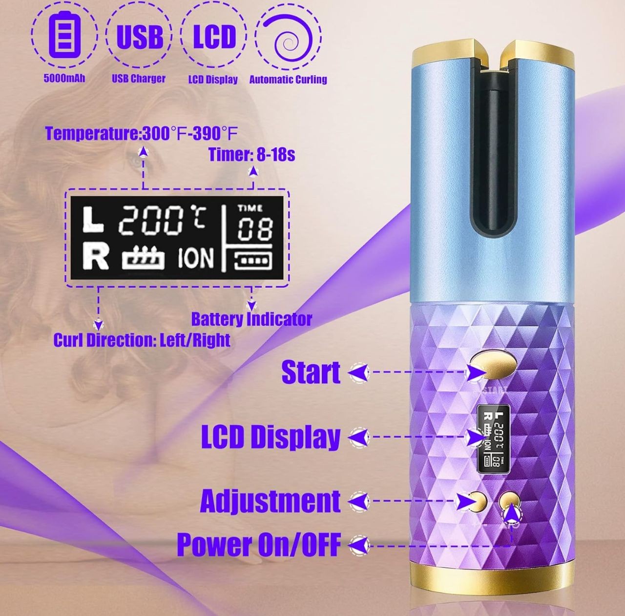 Écran numérique LCD : Le fer à friser sans fil dispose d'un écran numérique LCD qui montre : la température, la direction du curling, la minuterie, le niveau de la batterie. Batterie rechargeable intégrée de 5000 mAh, peut durer 60 minutes sur une charge complète (selon la température)