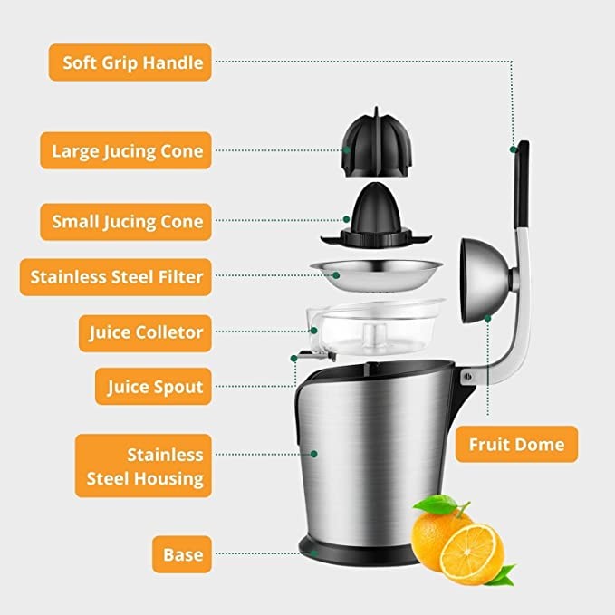 • le cône en acier inoxydable et la plaque filtrante maintiennent chaque moitié des agrumes, orange, citron et pamplemousse en toute sécurité et filtrent les graines et l'excès de pulpe.