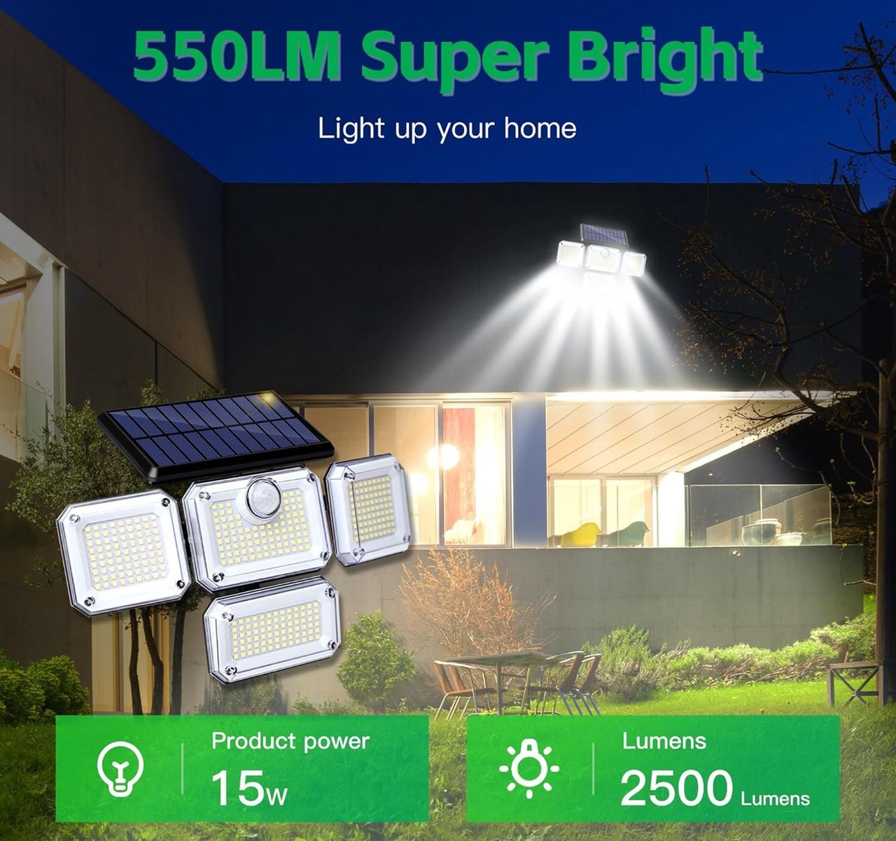 ÉCLAIRAGE RÉGLABLE : Lampe À Capteur De Mouvement Extérieure Avec Une Puissance Totale De 15 W Et 550 Lumens De Luminosité, Des Projecteurs Sans Fil À L'Extérieur, Cette Lampe Fournit Un Éclairage Clair Et Lumineux. La Lampe À Énergie Solaire À 4 Têtes Permet Des Angles D'Éclairage Personnalisables, Assurant Une Couverture Et Une Flexibilité Optimales. Projecteurs Sans Fil À L'Extérieur