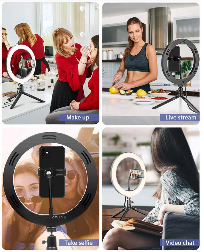 | Caract. 3 | Anneau lumineux rotatif à 360 ° et pince universelle pour téléphone Anneau lumineux à LED rotatif à 360 ° avec support, vous pouvez ajuster l'angle d'affichage de 45 °, 90 ° ou 180 ° en fonction de vos besoins. Avec une pince de téléphone rotative à 360 °, votre téléphone prend en charge la prise de vue verticale ou horizontale, la pince de téléphone réglable de 5,5 à 8,5 cm convient à l'iPhone 11/11 Pro / XS Max / XS / XR / X / 8/8 + / 7/7 + / 6, Samsung S10 / S10 + / S9 / S9 +, Huawei, etc. |