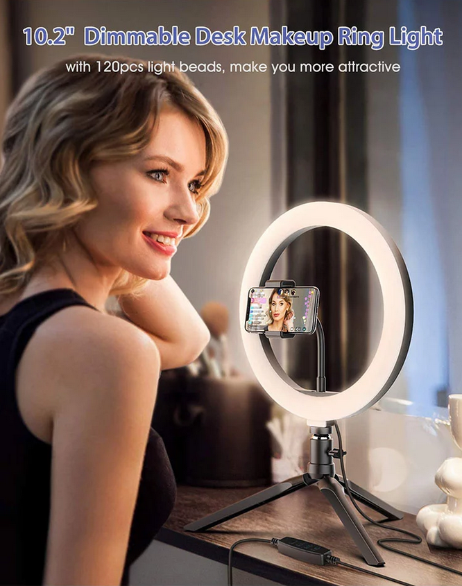 | Carcat. 2 | 3 modes d'éclairage et 11 niveaux de luminosité Anneau lumineux à DEL dimmable de 10,2 pouces avec 3 modes d'éclairage: chaud, naturel et froid, température de couleur: 2300K-6000K. Chaque mode d'éclairage a 11 luminosité réglable à choisir. Vous pouvez ajuster les modes et la luminosité pour répondre à vos besoins d'éclairage à différentes occasions. |