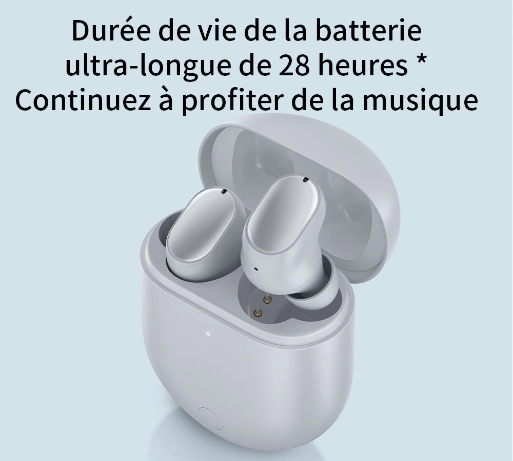 • Les Xiaomi Redmi Buds 3 Pro sont des écouteurs True Wireless, donc de type intra-auriculaires munis de la réduction de bruit active ainsi que de la recharge sans fil Qi. Ils sont compatibles avec la connexion Bluetooth 5.2, proposent jusqu'à 28 heures d'autonomie avec le boîtier et 10 minutes de charge permettent 3 heures d'écoute musicale.